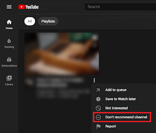 4) In the pop-up menu select Don't recommend channel. This action removes all the videos from that channel your recommendations.